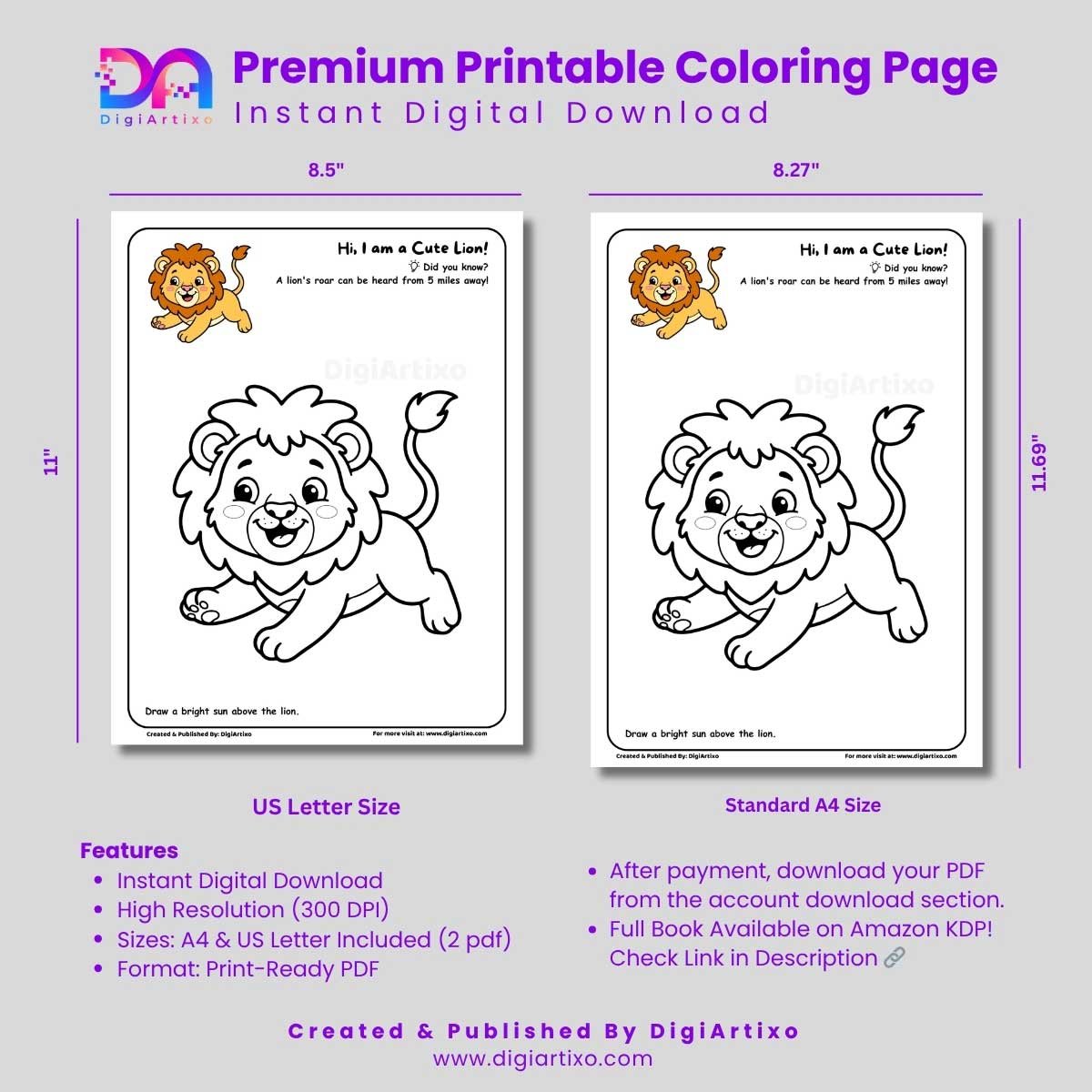 🐾 Cute Baby Lion Coloring Page Printable pdf | 2 High-Quality Coloring Pages in Single PDF |🖨️ Easy To Print in 2 Sizes (A4-8.27×11.69 Inches + 8.5×11 Inches Letter Size Supported) |👶 Perfect For Kids, Toddlers & Preschoolers |✏️ Thick Outlines For Easy Coloring | ✔Coloring Page Link will be Provided in a PDF File After Download | ✔ Instant Digital Download | ✔ This is a Digital Product. No Physical Item will be Shipped | NOTE: For More Details, Please See the Product Description Below.